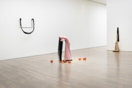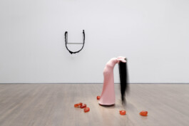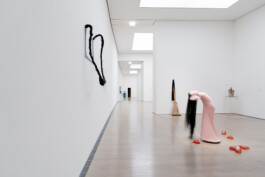 Meanwhile, the figure’s hair sweeps over blocks on the floor. These are faces formed from tofu and enclosed in synthetic resin. Suah Im thus relates a central ingredient of South Korean cuisine, suspended in its decomposition, to Dieter Roth’s chocolate-coated Gartenzwerg from the museum’s collection. A broom framed with the arms of a mannequin, tights and artificial hair leans next to it – a reference to the everyday, tasks specifically attributed to women and, after all, the ‘Kehrwoche’ (‘sweeping week’) practiced in southern Germany.